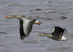 Іноді під час прольоту в Україні можна зустріти гусака-пискульку та червонозобу казарку. Обидва ці види занесені до Червоної книги, полювання на них заборонено.