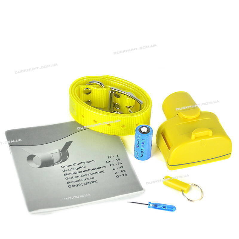 В комплект поставки входить: Яскраво-жовтий нашийник шириною 25 мм, довжиною 75 см, біпер, батарейка RC123 1шт, викрутка, магнітний ключ та інструкція російською мовою.