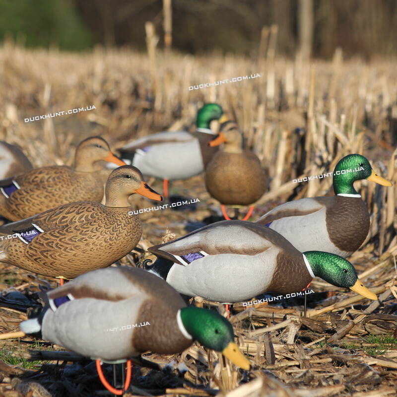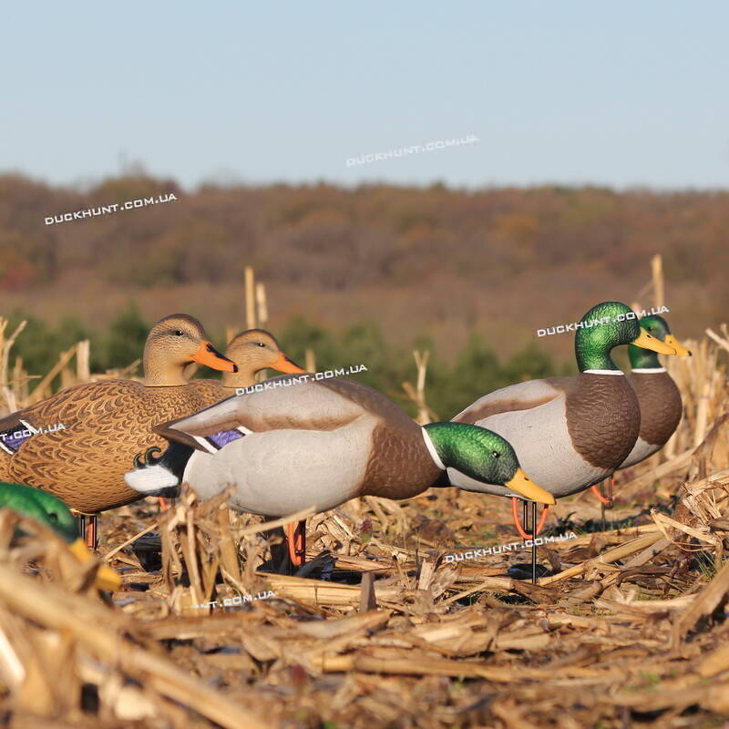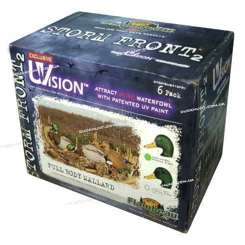 Опудало крякви від американської фірми Flambeau (Флембо). Storm Front 2 Full-Body Mallard Decoys - це повнооб'ємні опудала збільшеного розміру для полювання на полях, на берегах лиманів та на мілководді. Виготовлені з пластику та пофарбовані матовою, не блискучою фарбою UVision™ (Ультаровіжн), що копіює ультрафіолетове відображення реального пір'я качки. Комплект складається з 6 опудал: - 2 активних селезня, 2 селезня, що годуються, 1 активна самка і 1 самка, що годується. Чучела виставляються на металевих підставках-стійках і мають оригінальну систему, що забезпечує рухливість на вітрі, що надає більшої реалістичності. За бажання, опудала можна зафіксувати. Голови у опудал знімні і при встановленні можуть бути повернені в потрібну сторону. Вага комплекту – 5,6 кг.
