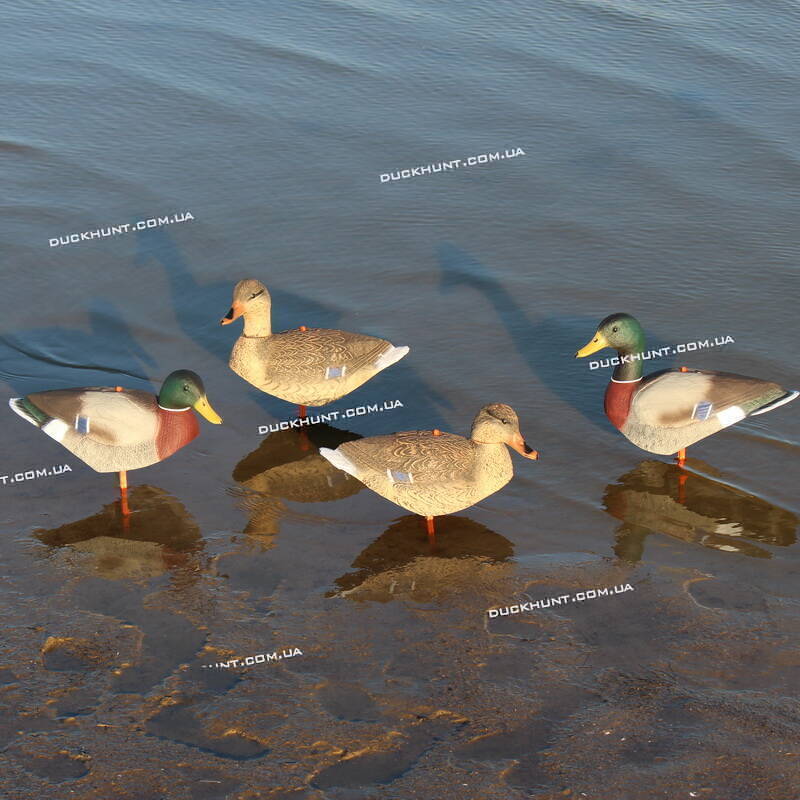 Комплект складається з 4 чучел: - сторожові селезень та качка, напіввідпочиваючі селезень та качка. Чучела виставляються на пластикових стійках і мають оригінальну систему, що забезпечує рухомість на вітрі, що надає більшої реалістичності. Голови у опудал знімні і при встановленні можуть бути повернені в потрібну сторону.