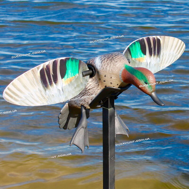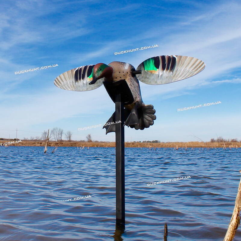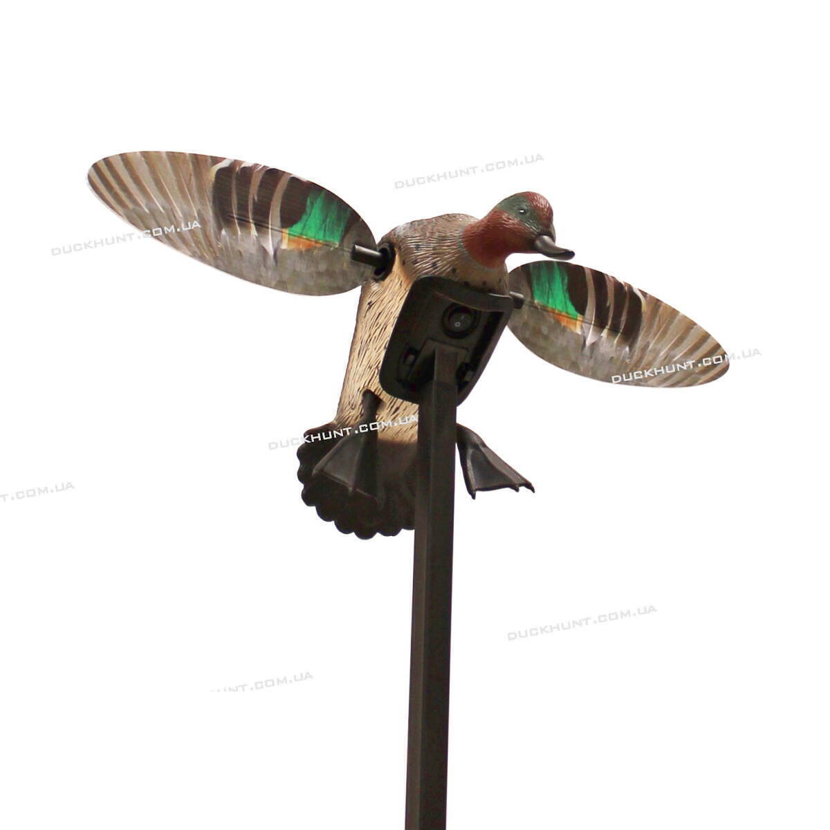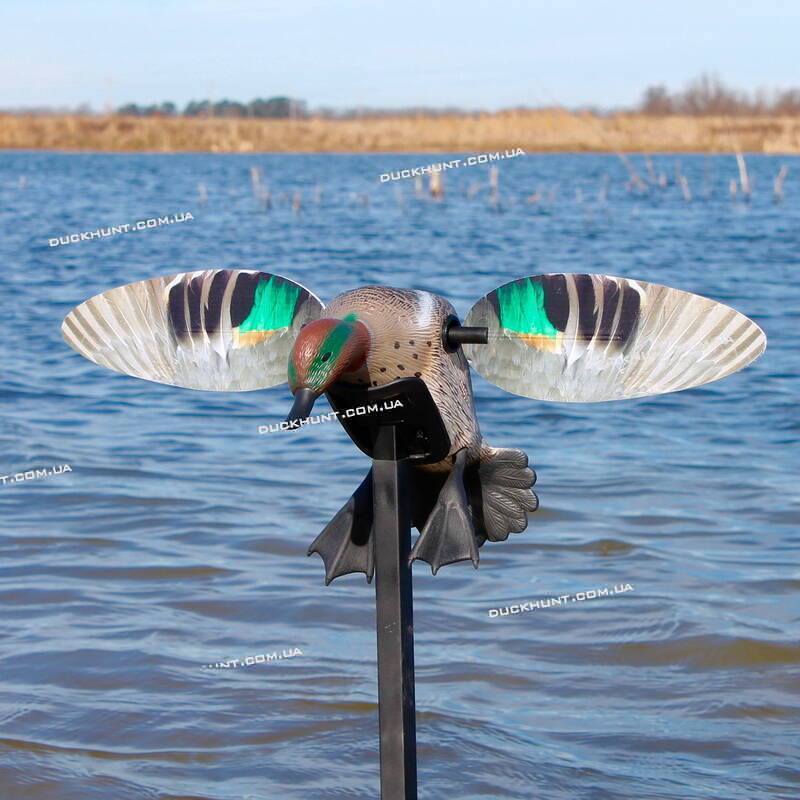 Американська фірма MOJO Outdoors (МОДЖО Аутдорс) представляє вашій увазі опудало селезня чирка з крилами, що обертаються MOJO® Elite Series™ - Green Wing Teal . Це абсолютно новий продукт, який відрізняється від усіх попередніх опудал, що випускається компанією MOJO. Корпус виготовлений із м'якого пластику, на якому фарба практично не стирається. 3D крила, що обертаються, на магнітних конекторах надають опудала реалістичний вигляд і створюють ілюзію махаючих крил. Тим самим опудало імітує посадку качки на воду і з далеко привертає увагу всіх водоплавних, що пролітають. Крила опудала обертаються рахунок електромотора, який живиться від 4х АА батарейок. Крила з магнітним конектором кріпляться швидко та надійно. Оновлена конструкція опудала дозволяє за лічені секунди зробити заміну живлення. На відміну від попередніх моделей, лапки виготовлені з гуми і не знімаються, що виключає їх втрату на полюванні.