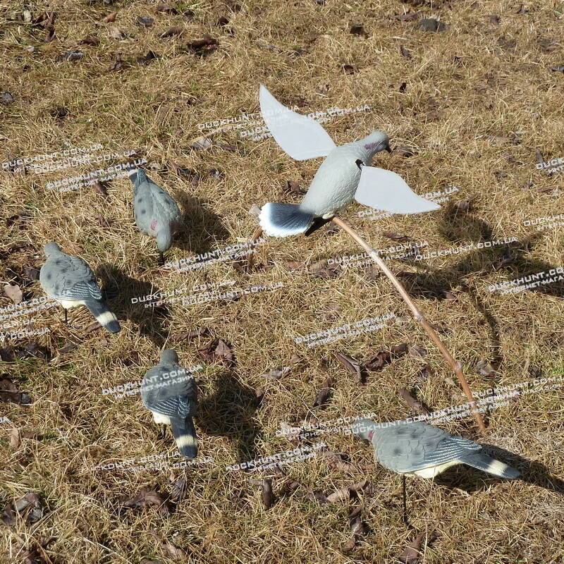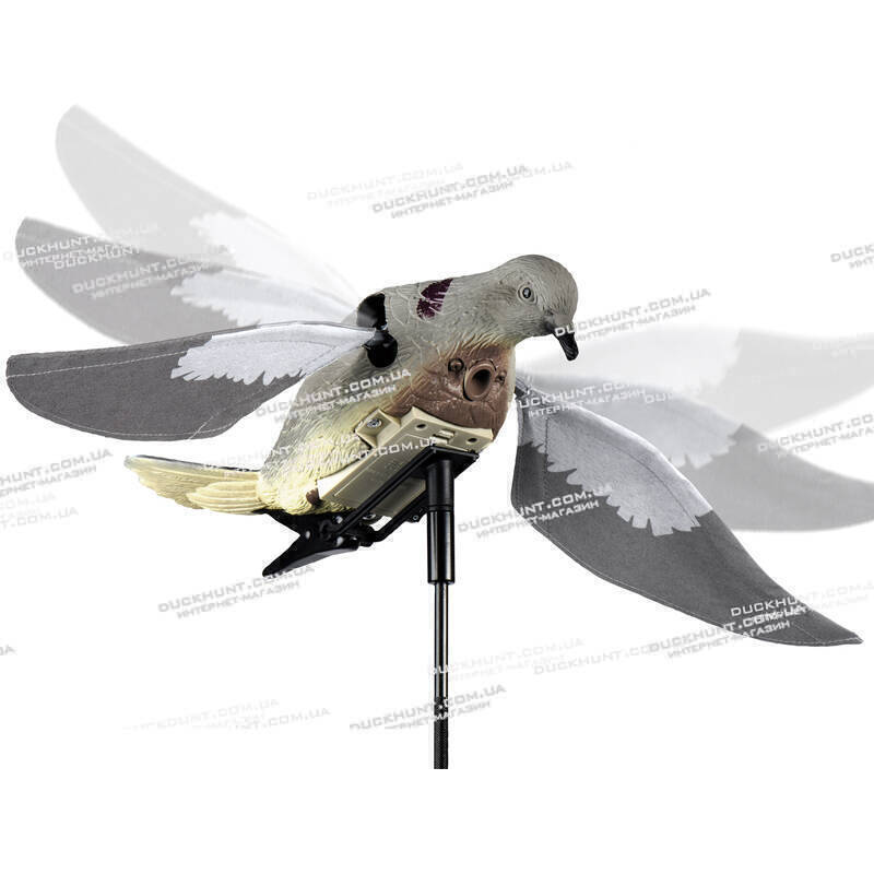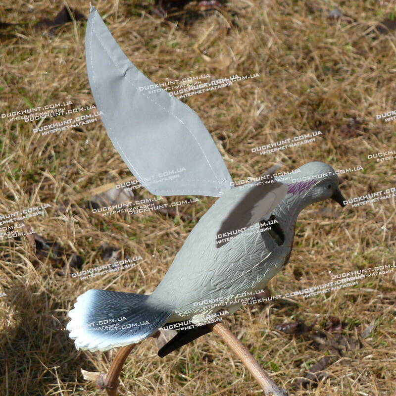 Чучело горлиці з крилами, що махають- Rapid Flyer Dove від фірми Lucky Duck. Крила рухаються вертикально, за рахунок електроприводу, тим самим зраджуючи опудала реалістичний вигляд. За допомогою прищіпки опудало можна з легкістю кріпити на сухих гілках дерев та інших улюблених місцях денки голубів. В комплект входить штанга для встановлення чучела та чохол для зберігання та перенесення. Крила знімні. Працює від трьох ААА батарейок, яких вистачає до 5 годин безперервної роботи.