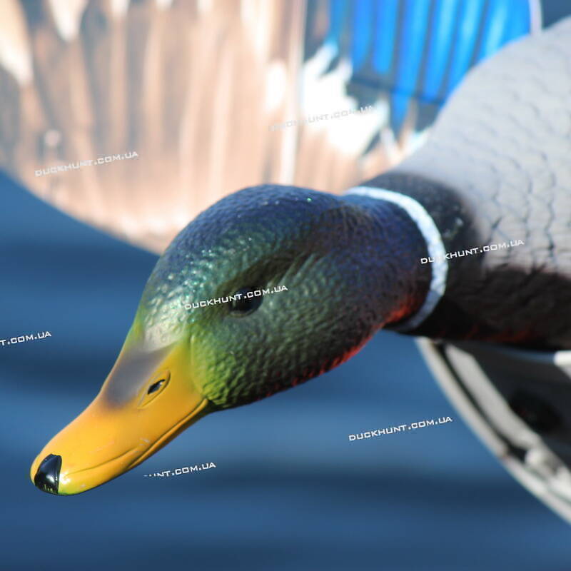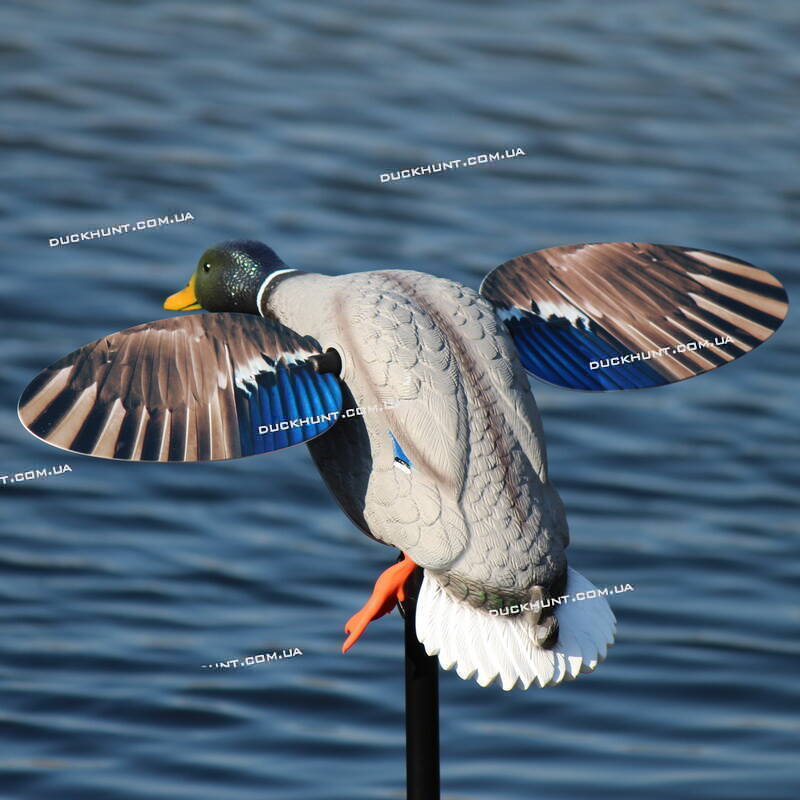 Серія Еліт має детальне промальовування пір'я та реалістичне матове забарвлення. Корпус виготовлений із м'якого пластику, на якому фарба практично не стирається. 3D крила, що обертаються, із серії Cloudy Day добре видно з далека у вечірній час і в похмурий день. Р асцветка крил виконана в двох кольорах (синій і коричневий) і повторює оперення крил, ніж самим зраджують опудала реалістичний вигляд і створюють ілюзію махають крил. Кріпляться крила за рахунок магнітів до знімного рухового відсіку і можуть працювати без основного корпусу (знімного), від пульта дистанційного керування (пульт поставляється в комплекті). Крила опудала обертаються рахунок електромотора, який живиться від АКБ 6 Вт. На відміну від інших моделей, двигун працює практично безшумно! Крила з магнітним конектором кріпляться швидко та надійно. На відміну від інших моделей, крила виготовлені з міцного пластику. Оновлена конструкція опудала дозволяє за лічені секунди зробити заміну живлення. Пучело складається з декількох частин і включає знімний (основний) корпус, в який поміщений двигун, акумулятор, вбудований приймач для підключення дистанційного керування та інші компоненти. На відміну від попередніх моделей, лапки виготовлені з гуми і не знімаються, що виключає їх втрату на полюванні. Крім того, є вбудований три позиційний перемикач живлення - в положенні 1 працює постійно, в положенні 0 вимкнений, в положенні 2 включається запрограмований таймер (йде в комплекті). Перемикач розташований на череві опудала крякви, який дозволяє мисливцеві самому вибирати режим руху крил.