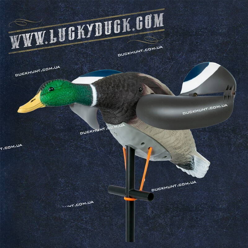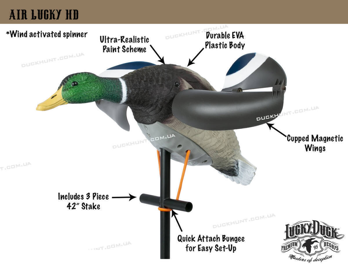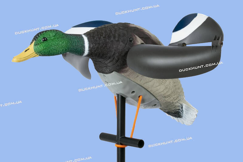 Опудало селезня з крилами Air Lucky Duck (Ейр Лакі Дак), що обертаються від вітру. Тепер вам не потрібно думати про батареї та акумулятори! Крила, що обертаються від вітру, створюють ілюзію махаючих крил і привертають увагу качок, що пролітають повз, чирків та інших водоплавних. Для того, щоб крила почали обертатися, потрібен вітер від 5 м.с. Рекомендовано використовувати з плаваючими чучелами – на лиманах, великих озерах та водосховищах, де є вітер. У комплект входить складна металева штанга для встановлення опудала. Крила знімні. Вага опудала з коробкою 1,6 кг. Розмір опудала (без крил) 52х14 см
