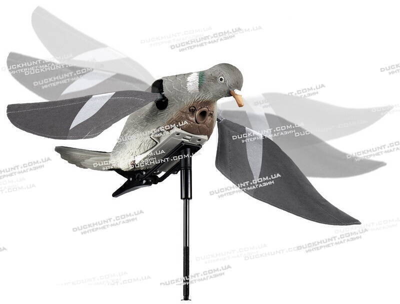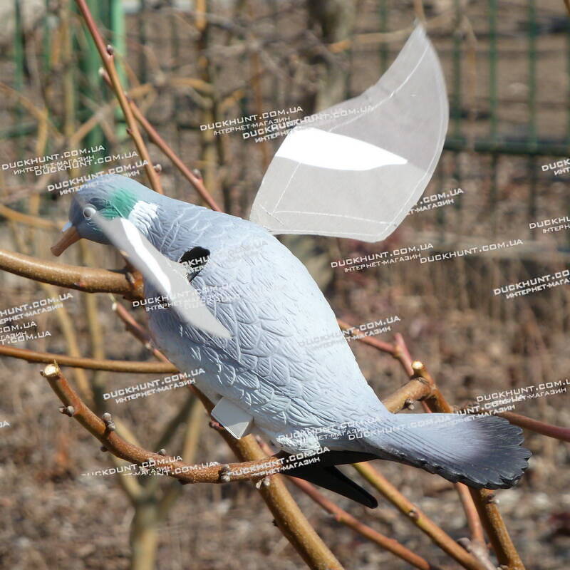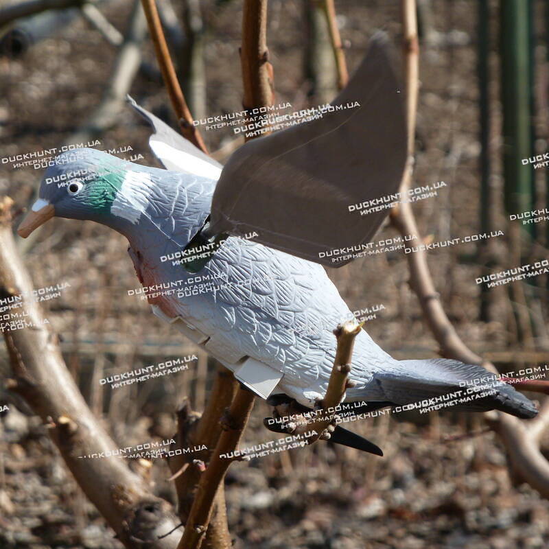 Чучело голуба з крилами, що махають, від фірми Lucky Duck (Лакі Дак). Крила рухаються вертикально, за рахунок електроприводу, тим самим зраджуючи опудала реалістичний вигляд. За допомогою прищіпки опудало можна з легкістю кріпити на сухих гілках дерев та інших улюблених місцях денки голубів. В комплект входить штанга для встановлення чучела та чохол для зберігання та перенесення. Крила знімні. Працює від трьох ААА батарейок, яких вистачає до 5 годин безперервної роботи.