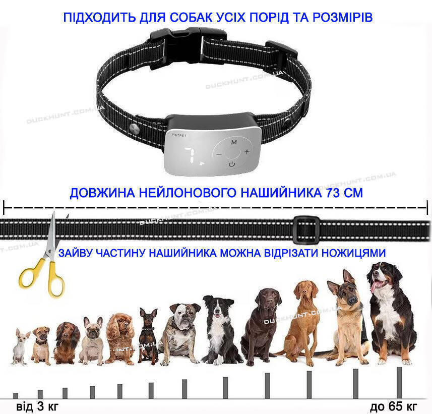 РЕГУЛЮЮЧИЙ СВІТЛОВІДРАЗНЮЮЧИЙ НАШИВНИК. Високоякісний нейлоновий нашийник зі світловідбивним покриттям підвищить безпеку Вашого собаки та покращить її видимість у темний час доби. Антилай нашийник для собак ідеально підходить для всіх порід собак вагою від 3 до 65 кг. Довжина нашийника легко регулюється в межах 10 - 73 см. Також є два різних розміри контактів (довгі та короткі), щоб відповідати різній довжині вовни собаки та торкатися її шкіри. Два комплекти м'яких чохлів, що проводять, захищають шкіру Ваших собак від натирання і подряпин, що робить навчання більш безпечним і гуманним.