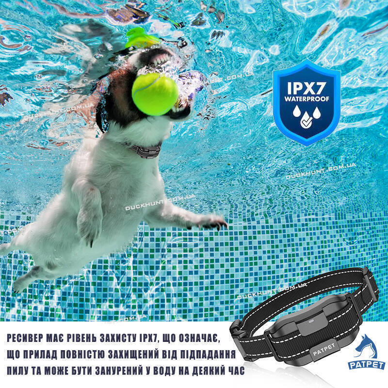 Ресивер електронашийника водонепроникний і має захист IPX7. Ваш собака може вільно плавати, приймати душ, грати в річці або бігати в дощовитий день із нашийником для тренування. Важливо! Перед цим, будь ласка, переконайтеся, що порт заряджання щільно закритий гумовою заглушкою.