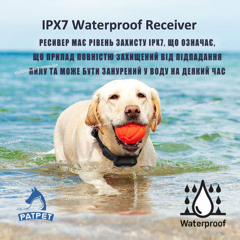 100% ВОДОНЕПРОНИКНИЙ (IPX7). Ваш собака може вільно плавати, приймати душ, грати в річці або бігати в дощовий день із нашийником для тренування. Важливо! Перед цим, будь ласка, переконайтеся, що порт заряджання щільно закритий гумовою заглушкою.