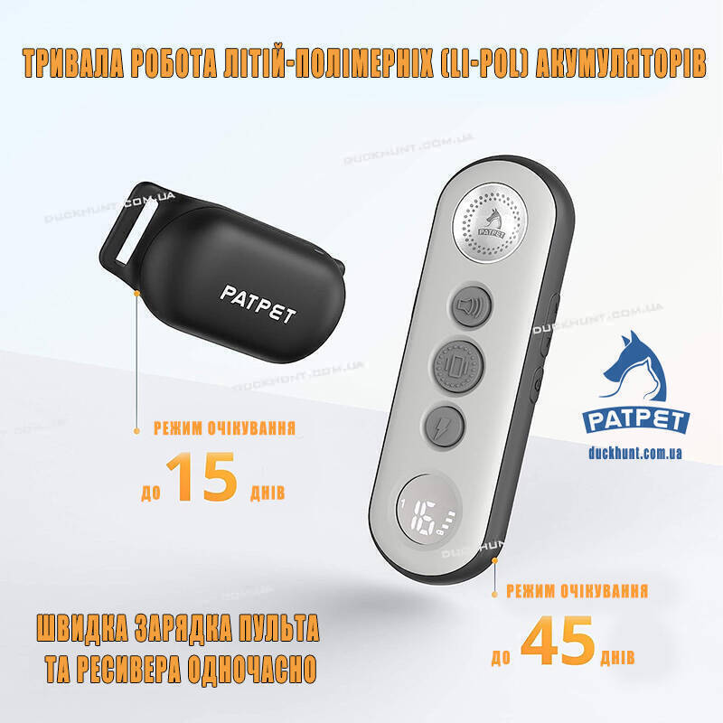 ПОТУЖНИЙ АКУМУЛЯТОР. Завдяки високоякісним акумуляторам пульт дистанційного керування електричного нашийника для собак можуть працювати до 45 днів у режимі очікування, а  приймач-ресивер може працювати до 15 днів у режимі очікування за повного 2,5 годинного заряджання.