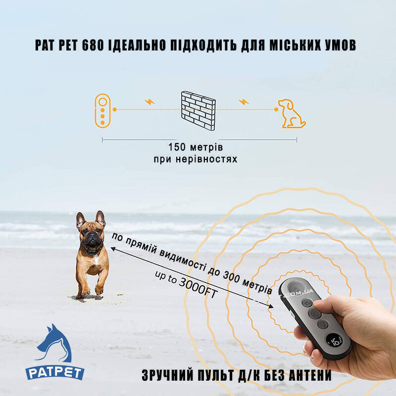 Нашийник для дресування собак PatPet 680 — з пультом дистанційного керування  допоможе навчити Вашого собаку основним командам і розв'язати проблеми з неконтрольованою поведінкою вихованця. Забезпечує зв'язок власника та собаки в радіусі до 300 метрів, що робить його ідеальним не тільки для дому, але й для будь-якої прогулянки. Підходить для всіх порід собак вагою понад 3 кг. Довжина нашийника регулюється в межах 0-68 см. Завдяки маленькому ресиверу ця модель підійде для найменших порід собак.
