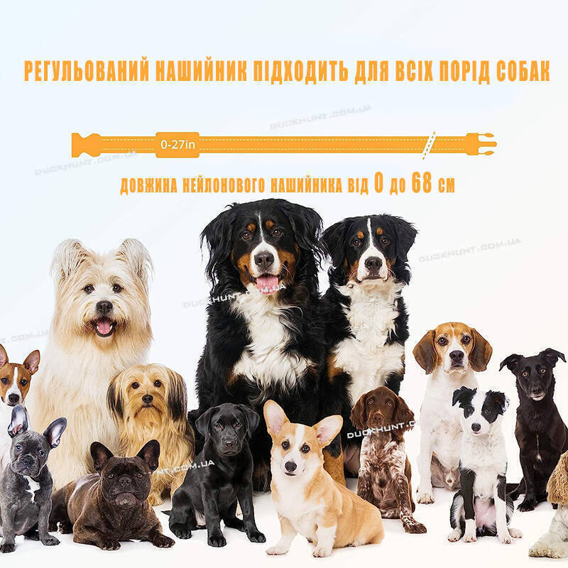 РЕГУЛЬОВАНИЙ НАШИЙНИК. Підходить для всіх порід собак вагою понад 3 кг. Довжина електро нашийника для собак легко регулюється в межах 0-68 см.  Також до комплекту входять м'які струмопровідні силіконові ковпачки  на контакти, які захищають шкіру Ваших собак від подряпин і потертостей, що робить навчання безпечнішим і гуманнішим.