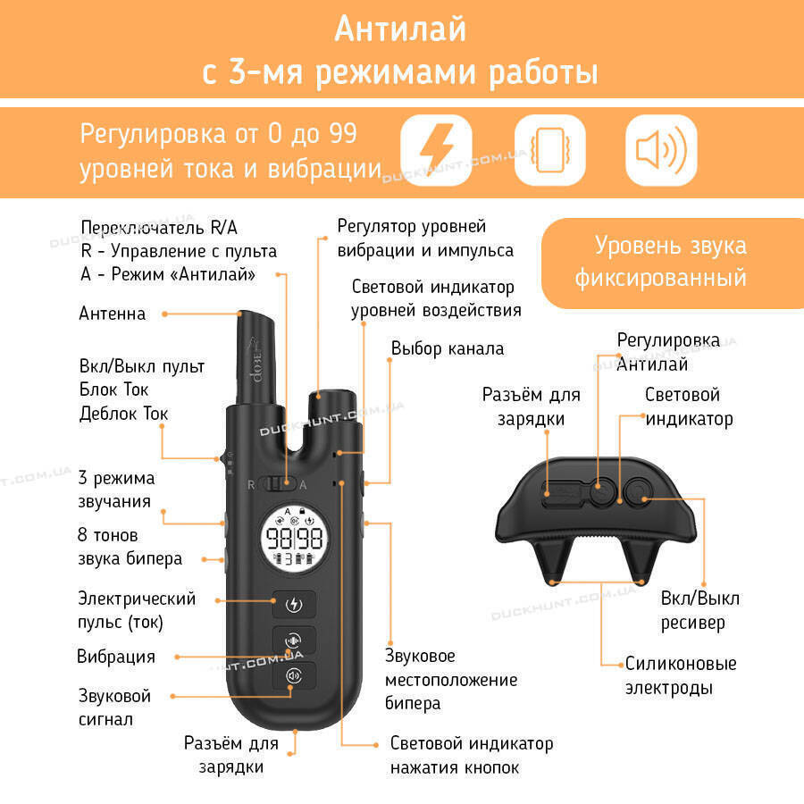 У тренувальному нашийнику DOBE DB600 вбудована функція антилай із 3 режимами роботи, що сприймають вібрацію голосових зв'язок і звук гавкання. Сила впливу вібрації й ел.імпульсу налаштовується до 99 рівнів, це дає змогу підібрати мінімальний чутливий поріг для собаки.