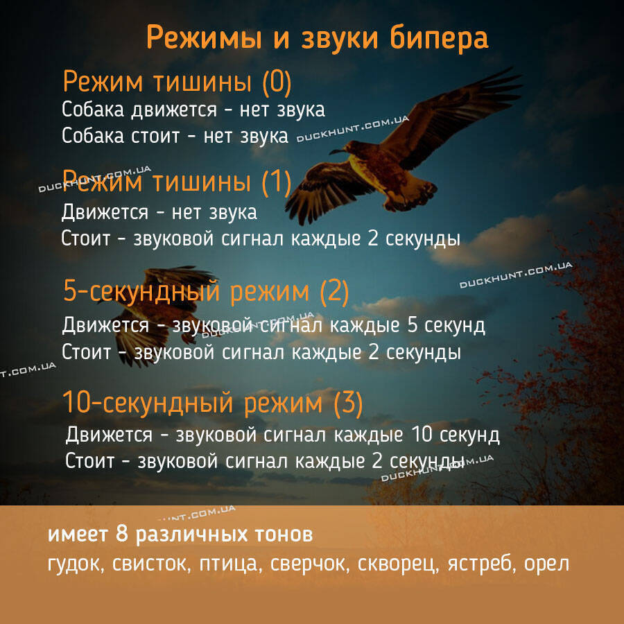 Біпер DB600 має 8 різних зуків —гудок, свисток, птиця, цвіркун, шпаків, яструб и орел. Звуки ви можете виставляти залежно від місця полювання або вашого бажання. Біпер має 4 робочі режими, які виставляються залежно від умов полювання.