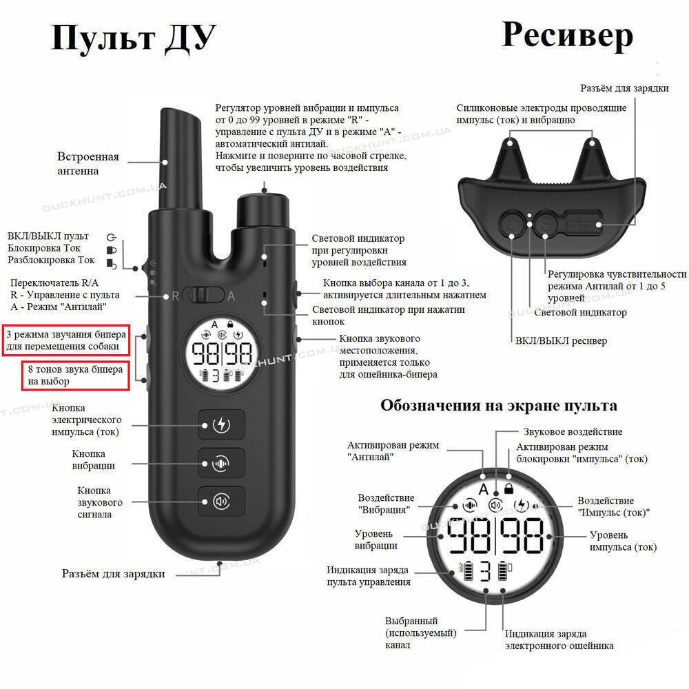 Ресивер і біпер, виготовлені з ударостійкого пластику, мають водонепроникну конструкцію, працюють від вбудованих акумуляторів. Вологозахищений пульт можна використовувати в дощовиту або вологу погоду (одна краще не мочити), зате ресивер і біпер повністю водонепроникний — ваш собака може вільно плавати у воді (не більш ніж 30 хвилин і не глибше 1 метр відповідно до ступеня захисту IP67), але найважливіше, перевіряйте, щоб гумові кришки, що закривають USB-порти для заряду акумуляторів були повністю закриті (герметичні)!