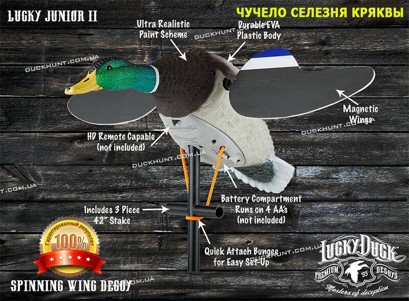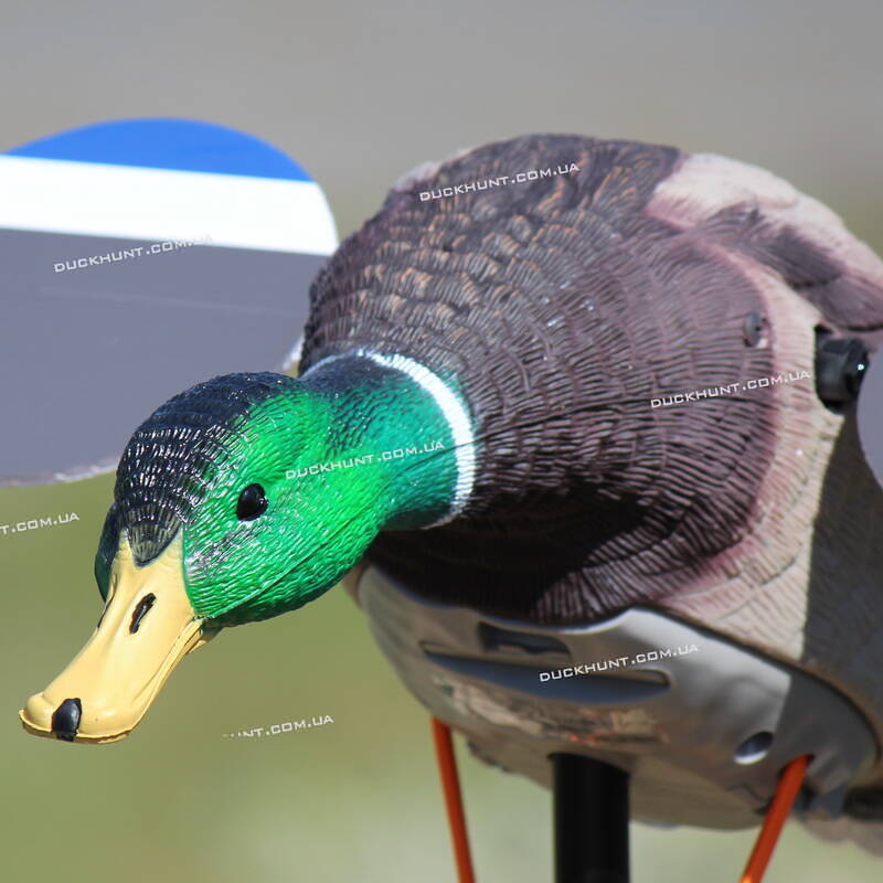 За рахунок крил, що обертаються, опудало імітує посадку качки, чим привертає увагу всіх водоплавних. Крила мають магнітний конектор і рухаються за допомогою електроприводу. Корпус виготовлений з пластику "EVA" (м'який пластик-легкий та еластичний полімерний матеріал), детальне промальовування оперення, реалістичне забарвлення та форма опудала. Новий варіант кріплення опудала на стійку, установка займає лічені секунди, при транспортуванні через відсутність частин, що випирають, займає набагато менше місця. Працює від чотирьох батарей АА . Однією з переваг цього опудала є можливість встановлення 6 Вт акумулятора, а також встановлення пульта ДК для економії заряду батарей або АКБ. Рекомендовано використовувати з плаваючими чучелами – на великих та малих водоймах.