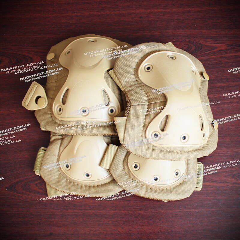 Тактичний набір з 2 наколінників та 2 налокітників захистить вас від травм, переломів, садна, синців. Він незамінний для військових, страйкболістів, велосипедистів, любителів екстремального спорту. Наколінники та налокітники універсального розміру, анатомічної форми, щільно сидять і не заважають рухам. Матеріал чаші – ударостійкий пластик. Він не тріскає, довго не дряпається, витримує значні навантаження. Внутрішня поверхня виробу виготовлена з м'якого поролону, що забезпечить комфортну посадку на руки та ноги. М'яка тканинна оббивка виготовлена з кордури, вона не рветься під час носіння. І наколінники, і налокітники фіксуються двома парами ремінців на липучках.