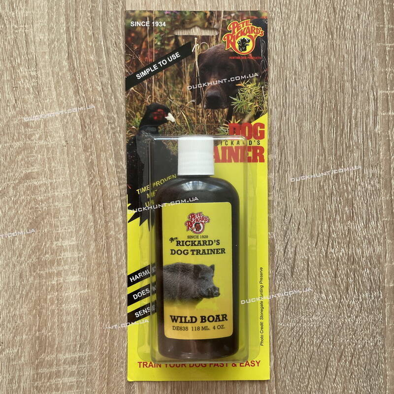 Концентрат запаху дикого кабана Wild Boar Training Scent призначений для натаски та тренування собак. Концентрат наноситься на апортувальні предмети, такі як поноски та муляжі дичини. Максимальний ефект і стійкість запаху досягається при нанесенні концентрату на стрімер запаху або всередину проноски за допомогою шприца. Такий варіант нанесення утримує запах дичини довгий час. Застосування концентрату запаху ефективно покращує процес навчання мисливських собак як на суші, а й у воді. Концентрат запаху виготовлений на основі натуральної сечі, жирів, залоз та та вовни дикого звіра. Об'єм 118 мл.