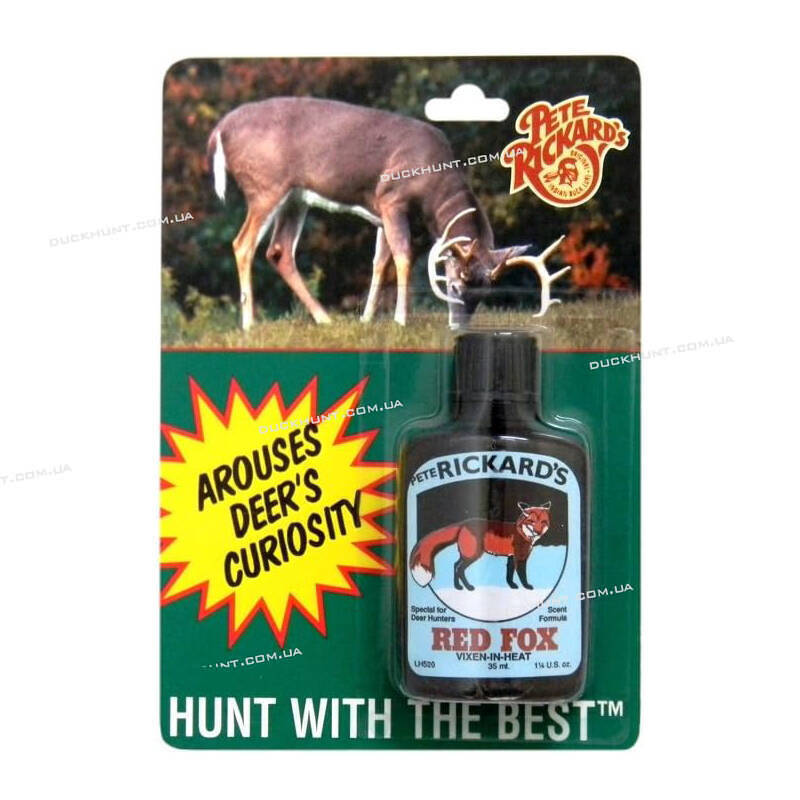 Pete Rickard Red Fox Vixen-In-Heat Urine – це чудовий маскуючий запах, який можна використовувати у будь-який час, коли ви хочете приховати свій запах від диких тварин. Мисливці та ловці хутрового звіра (траппери) у США протягом багатьох років використовують сечу лисиці для маскування свого запаху. Її легко використати. Просто нанесіть кілька крапель сечі на підошви ваших черевиків і вирушайте до місця полювання. Підходячи до місця засідки, ви залишаєте за собою слід запаху сечі. Коли ви опинитеся за 30 метрів від вашої засідки, обійдіть навколо неї. На місці засідки обприскуйте сечею ватяні подушечки/тампони і розвішайте їх на гілках в радіусі 20 метрів від себе. При виборі місця засідки обов'язково враховуйте напрямок вітру. Освіжайте тампони кожні дві години кількома краплями. Для кращих результатів полювання використовуйте манки на звіра. Зберігайте аромат, що залишився, в прохолодному темному місці для використання в наступному сезоні.