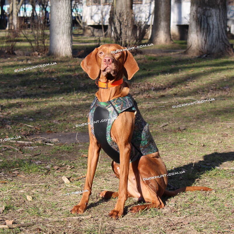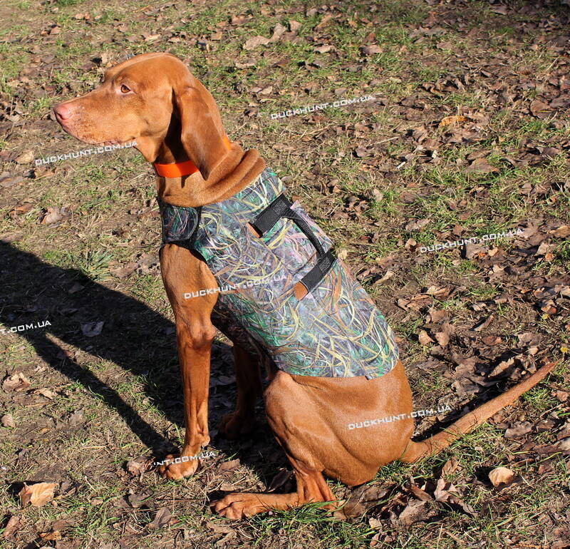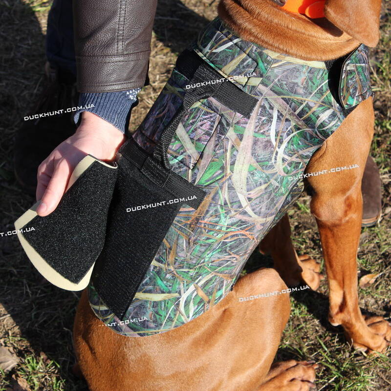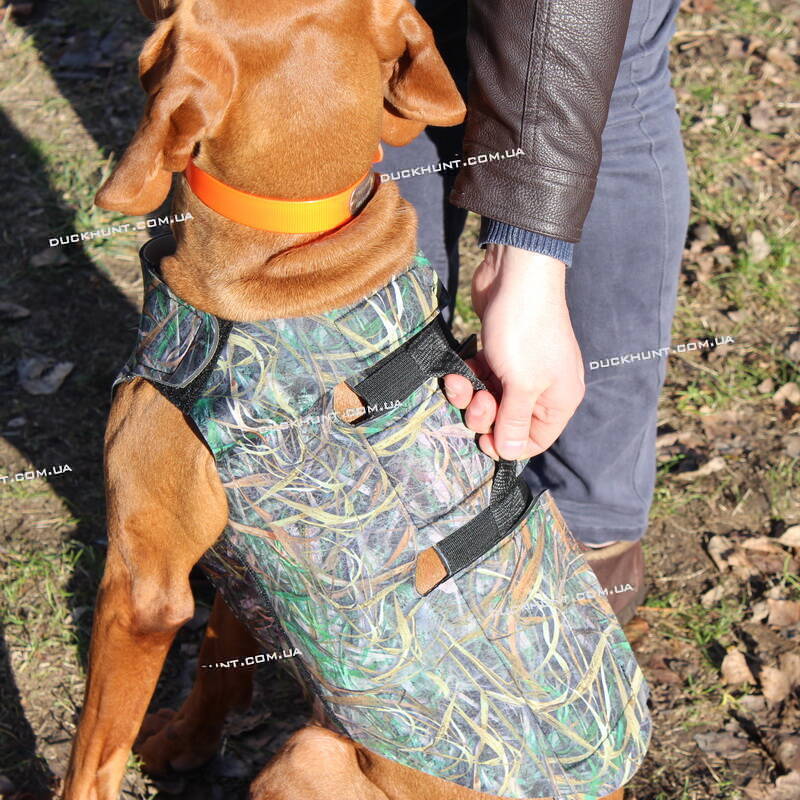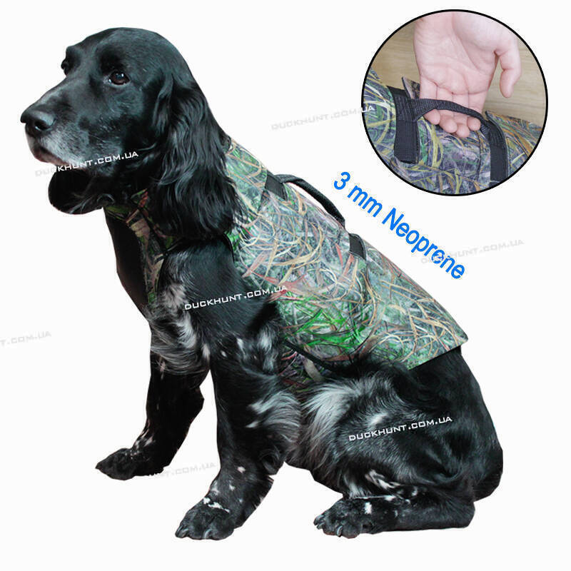 Жилет виконує кілька функцій: гріє, маскує на полюванні та захищає від предметів або рослинності, які можуть поранити вашого чотирилапого друга. Оснащений міцною ручкою на спині, що дозволяє швидко витягнути собаку із води.