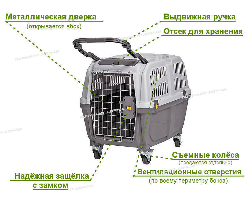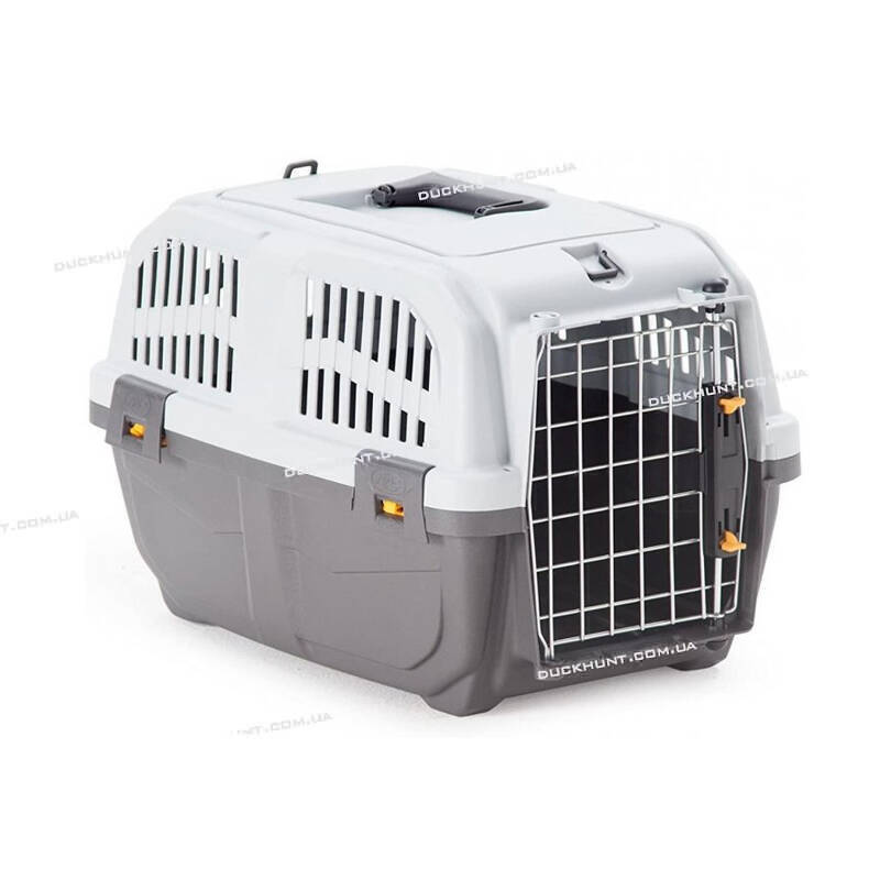 Пластиковий бокс для транспортування тварин у літаку, а також будь-якому іншому транспорті. Стандарт IATA (міжнародний стандарт для авіа-перевезень) передбачає наявність спеціального замка-засувки для дверцят, який перешкоджає довільному відчиненню дверей під час транспортування тварини. Є висувна ручка для зручності, металеві двері, надійні бічні клямки. Металеві двері відчиняються в один бік. В наявності 7 розмірів переносок.
