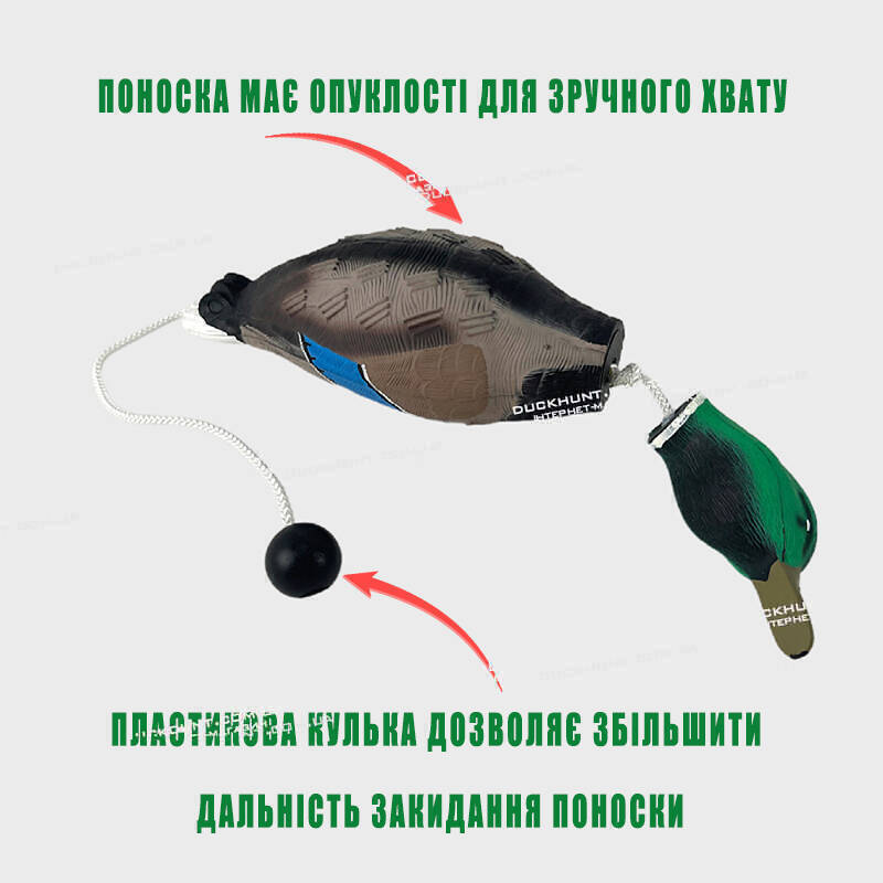 За рахунок своєї конструкції поноска-апорт виробляє у собак правильний хват при подачі дичини. Шнур на хвості та пластикова кулька-упор дозволяє закидати поноску на великі відстані.
