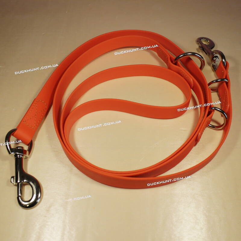 Повідець-перестібка PVC (повідець з двома карабінами на кінцях) має довжину 1.9 метра та 3 кільця по всій довжині. Ширина 19 мм . Відстань між кільцями 60см, 90 см і 40 см. Матеріал PVC . Колір оранж.