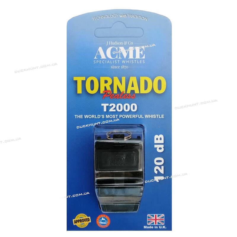 Acme T2000 Tornado - один із найпотужніших у світі свистків. Має дві високі частоти для гучності, близькі до свисту, і нижню третю висоту для відстані. Усі три частоти звучать одночасно.