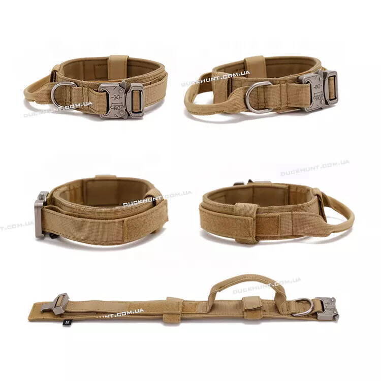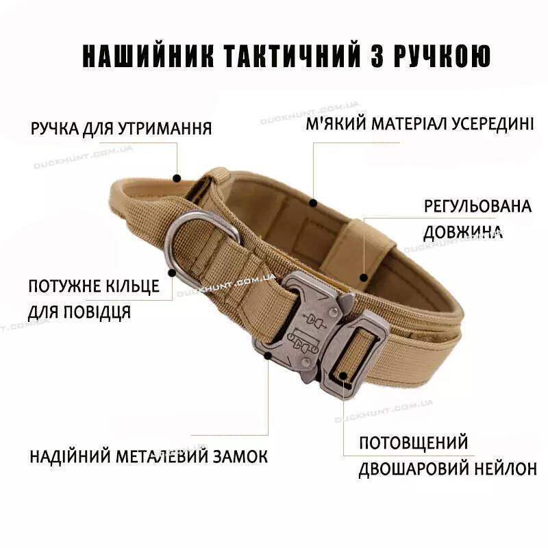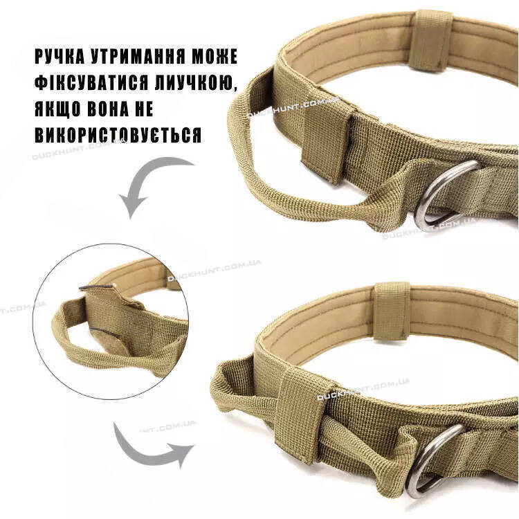 Тактичний нашийник із ручкою для службових собак. Ідеально підходить для занять та дресировок, а також для прогулянок. Є можливість кріплення патчу на липучці. Нашийник виготовлений із міцного матеріалу-поліпропілену, який витримує максимальні навантаження до 200 кг. Внутрішня частина нашийника має м'яку основу та не натирає шию при стримуванні собаки. Не плутає та не обриває шерсть на шиї. Надійна фіксація регулювання довжини нашийника. Потужний металевий замок. Ручка стримування має надійну фіксацію. Нашийник не вигоряє на сонці, при правильному зберіганні.