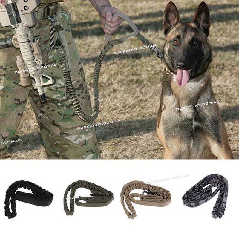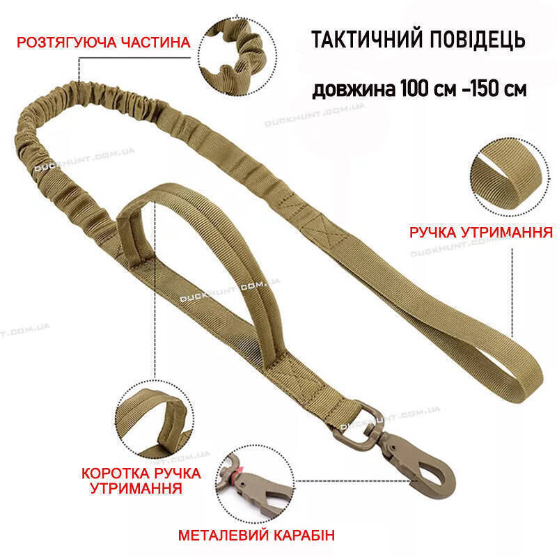 Тактичний повідець службових собак, що амортизує, з ручкою утримання на коротке. Довжина повідця - 100см, розтягується за зусилля до-150 см.