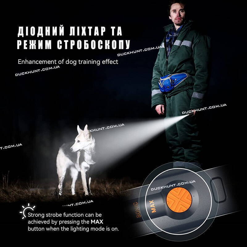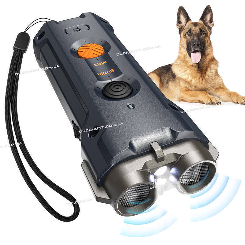 Унікальність цього ультразвукового відлякувача в тому, що він має 2 режими звукових сигналів: високий ультразвук і звичайний ультразвук. Це робить пристрій універсальним, адже його можна використовувати навіть для дресування хатніх вихованців. Крім ультразвуку, у відлякувач вбудований LED світлодіодний ліхтар з двома режимами роботи: постійне світло та миготливий (стробоскоп), що потрібно для нічних прогулянок із собакою!